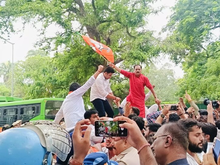 प्रदर्शनकारियों ने पुलिस द्वारा लगाए गए बेरिगेट्स को तोड़कर कांग्रेस मुख्यालय की ओर बढ़ने की कोशिश की जिसके बाद दूसरे बेरिगेट्स के सामने उन्हें रोका गया और पुलिस ने प्रदेश अध्यक्ष वीरेन्द्र सचदेवा, सांसद तेजस्वी सूर्या, प्रदेश युवा मोर्चा अध्यक्ष सागर त्यागी एवं अल्पसंख्यक मोर्चा अध्यक्ष अनिस अब्बासी सहित अन्य पदाधिकारियों को डिटेन कर तिलक मार्ग थाने ले गई जहां से कुछ देर बाद चेतावनी देकर छोड़ दिया।