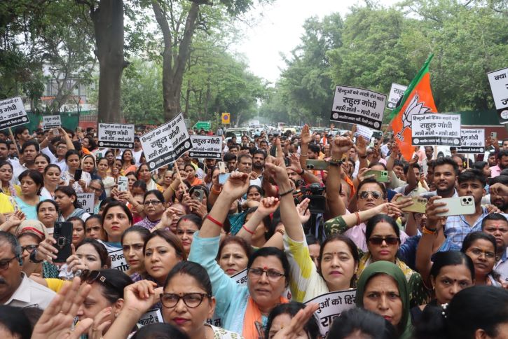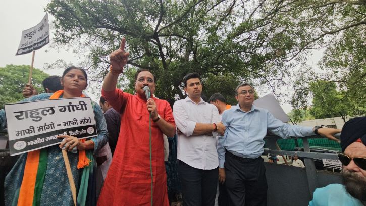 नई दिल्ली। दिल्ली भाजपा अध्यक्ष वीरेंद्र सचदेवा के नेतृत्व में आज दिल्ली भाजपा ने कांग्रेस नेता राहुल गांधी के हिंदुओं को हिंसक समुदाय बताने के ब्यान के खिलाफ कांग्रेस मुख्यालय के समीप जोरदार विरोध प्रदर्शन किया और राहुल गांधी को देश के हिंदुओं से माफी मांगने की मांग की।