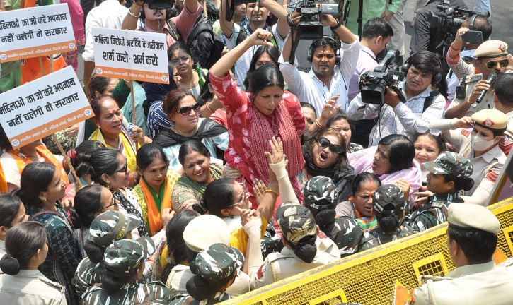 नई दिल्ली। दिल्ली भाजपा अध्यक्ष वीरेंद्र सचदेवा के नेतृत्व में आज महिला मोर्चा ने दिल्ली के मुख्यमंत्री अरविंद केजरीवाल के आवास के बाहर आम आदमी पार्टी की महिला सांसद के साथ हुए अभद्र दुर्व्यवहार के खिलाफ प्रचंड विरोध प्रदर्शन किया।